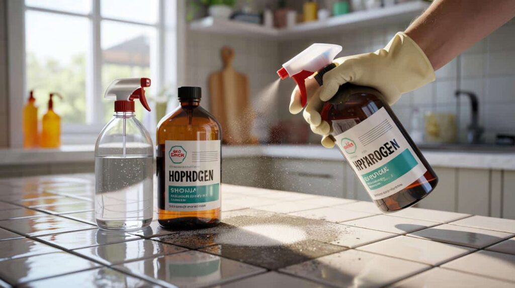 The expert-backed method is simple and surprisingly gentle. You clean the surface first with soap and water if it’s visibly dirty. Then you spray white vinegar and let it sit for a few minutes. Wipe. After that, you spray hydrogen peroxide (3% solution, the standard pharmacy kind), let it sit again, then wipe or rinse. Two steps. Two bottles. No drama.