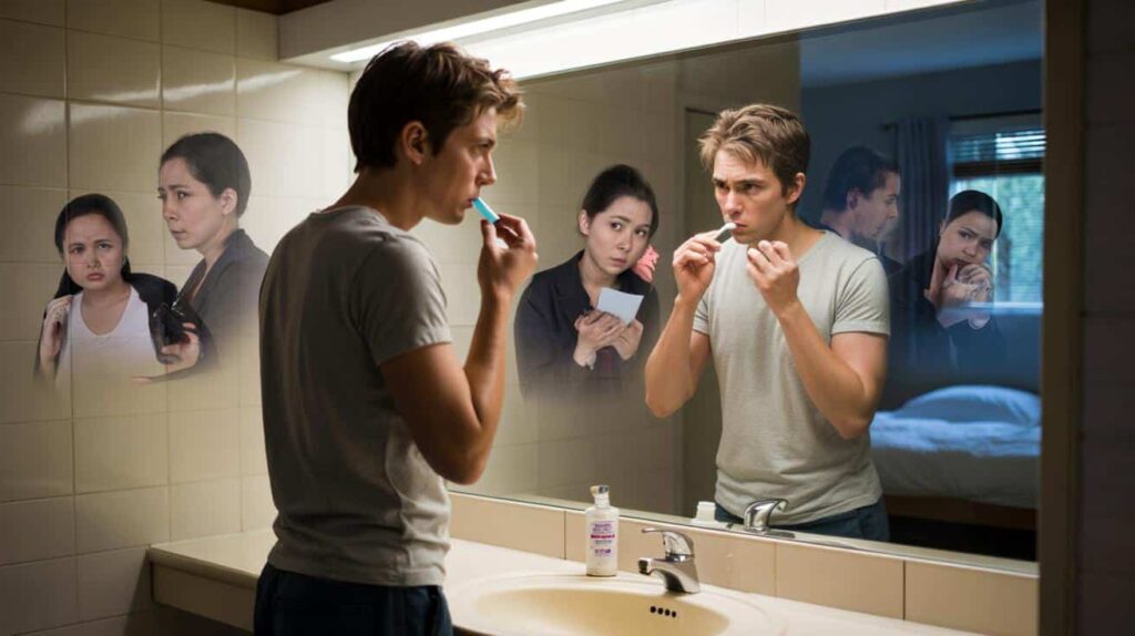 You rinse your mouth, shake your head, grab your phone. For a second it fades.