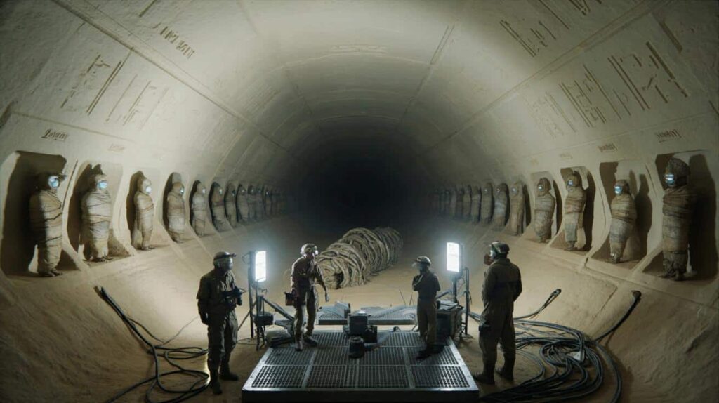Then came the moment that jolted the entire team into a new kind of unease. One of the side niches held an object about 1.2 meters long, wrapped in layers of what looked like mineralized fabric. Using a contactless imaging rig, they scanned it in situ. The 3D reconstruction that appeared on the monitor revealed articulated segments, interlocking plates, and an internal framework that was… not human, not animal, and not obviously mechanical.