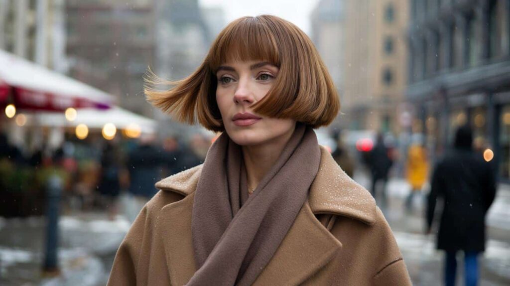 The broom bob isn’t soft or apologetic, and that’s exactly why it’s catching fire this winter. This is the season of big coats, giant scarves, and high collars that swallow delicate cuts whole. A floaty, layered lob disappears into wool. A long, fine mane ends up trapped in a scarf knot. The broom bob cuts right through all that bulk. When the ends hit that magic zone between collarbone and jaw, they sit perfectly on top of coats and sweaters, like punctuation. The face doesn’t drown in fabric. It stands out.