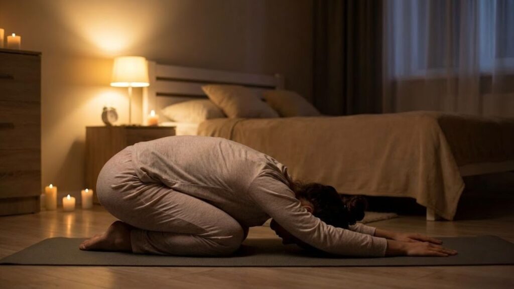 A short yoga routine before bed can help calm your mind when thoughts keep looping or your muscles feel tight after a long day. This is not designed as a workout, but as a gentle signal to your body that it is time to rest. These five simple poses are beginner-friendly, require no flexibility, and work best when paired with slow breathing in a quiet, calming space.