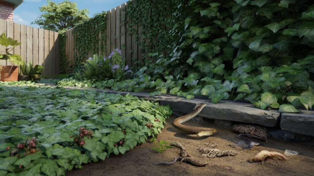 Think of dense ivy, creeping juniper, or thick mints carpeting the base of a fence or wall. Under that cool, dark blanket, life thrives. Slugs, insects, small rodents. All the things snakes consider a buffet.